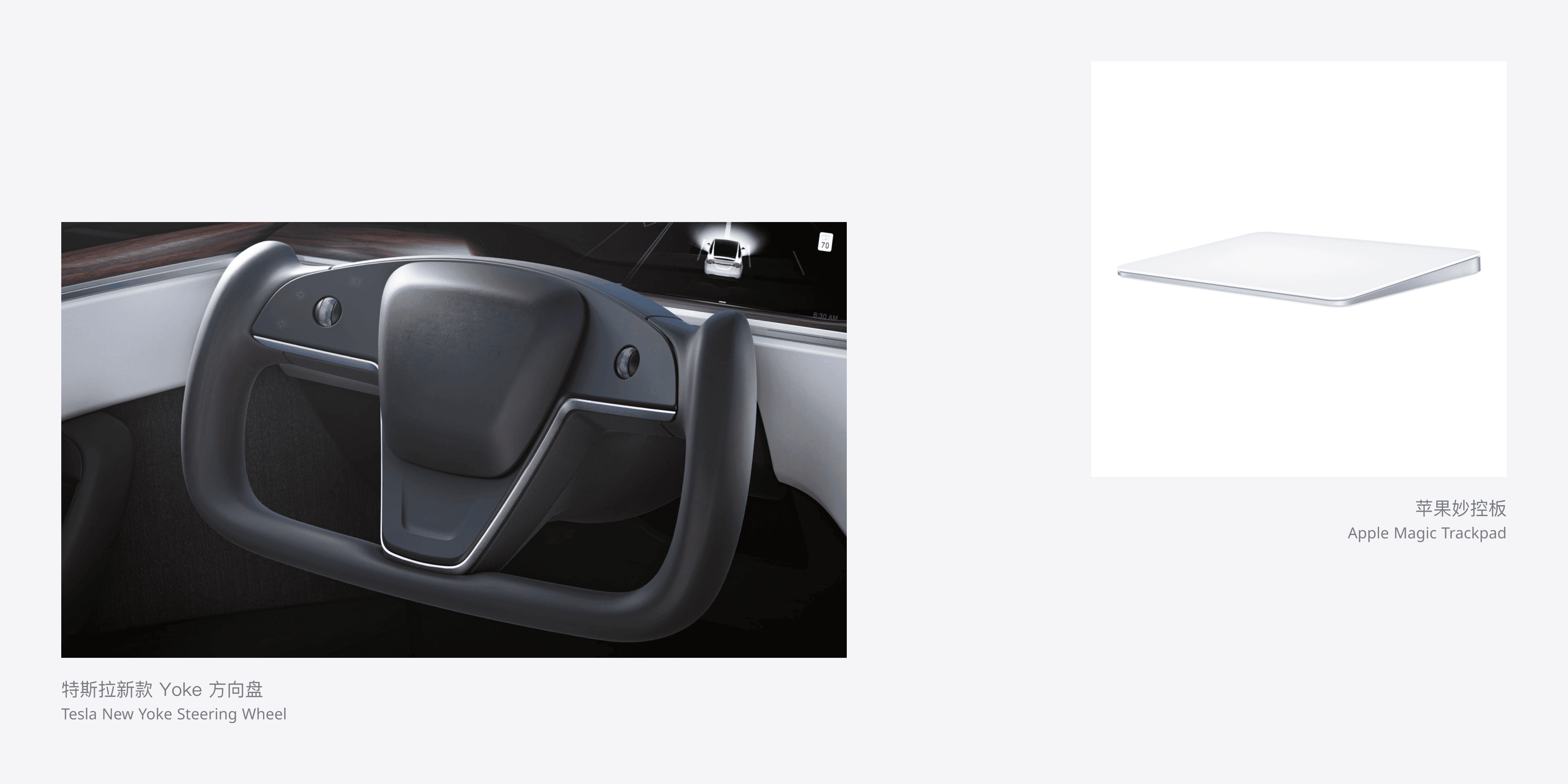 触感反馈,在智能手机上已经被广泛应用,通过马达细腻的震动来模拟不同的交互感受。然而,在驾驶场景下,带给用户震动反馈的不是屏幕,而是用户与车辆触碰的部分,如手与方向盘,身体与座椅,因此触感反馈需要集中在这两个方面进行设计。当发生碰撞预警时,方向盘和座椅的震动,能够帮助用户迅速提升注意力以避免危险发生。此外,在车辆状态发生变化、安全通知出现或重要提示出现时,也可结合方向盘震动来强化对用户的提示。在特斯拉新款车型中,取消了物理挡杆,将原有功能作为按钮集成在了方向盘上,这些按钮在按下时会有震动反馈,以模拟真实感,从而改善用户的操作体验。这样的设计会联想到苹果的 Magic Trackpad (妙控板),其本身不具备任何物理按下反馈,所有的感受均来自于震动强度,通过不同的震动频率实现了点击、长按、居中提示等一系列反馈。