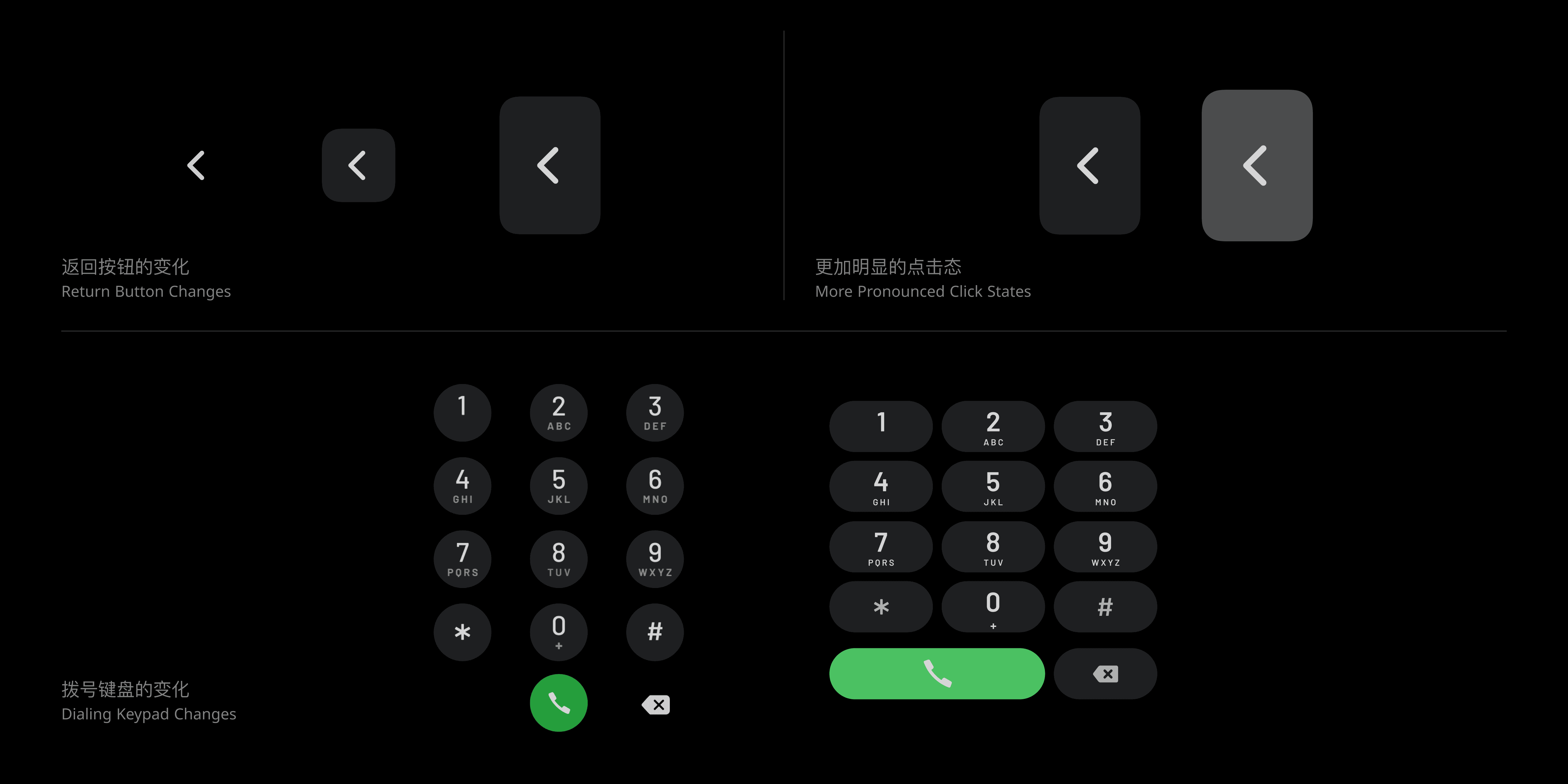 视觉强化,是提升信息呈现效率的一个基础方法。举例来说,在产品的二级界面中,常见的返回按钮使用一个简洁的图标即可准确表达,且易于点击。然而,在车内屏幕中,需要采用更加明确的按钮样式,来强化信息的传递,同时提升用户在驾驶情况下点击前的信心。尽管修改后的方案受到用户的广泛好评,但通过测试与用研反馈后发现,点击操作的精准性和点击感受依然存在问题。因此,将按钮尺寸进行了调整,使其更适合多数人手指点击区域,并增加明显的点击动画,以进一步的提升点击感受。以此方法,对多个控件进行了调整,如电话的拨号键。通过运用视觉强化的方法,以最大化弥补用户注意力缺失的问题,使用户在复杂的驾驶环境下,可以迅速获取信息,从而降低操作难度。