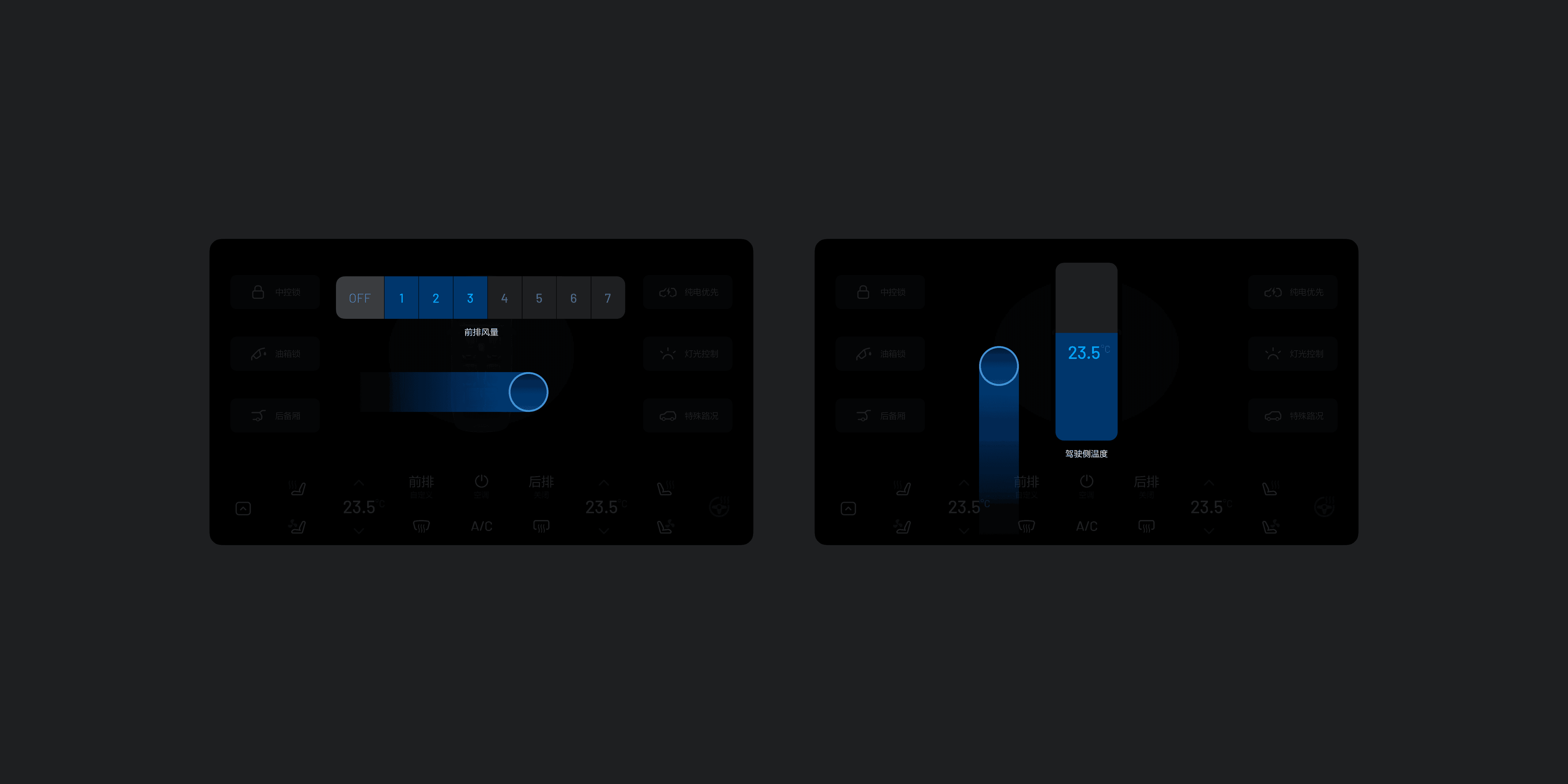 《解决驾驶员注意力减弱的多维度策略》中提到的多维度反馈,也是提升安全性的设计手段之一。通过视觉、音效和动效的综合运用,使驾驶员可以在集中关注道路情况的同时,能够高效完成对车辆的操作及信息的获取。在上述的空调控制案例中,虽然通过盲操手势提高了操控便捷性,但实际场景中发现,用户仍需低头确认当前调节的温度数值及风量档位,还是存在安全风险。因此,在后续的设计迭代中进行了改进。控制屏调节空调时,结合仪表屏进行实时调节数据的显示,以使驾驶员用较小的视线偏移,即可确认当前空调的调节状态。同时,在空调盲操手势中也增加了阶梯式音效,从声音上辅助用户对数据调节的感知,进一步提升操作的安全性。